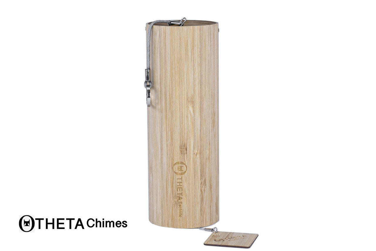 The Theta Chimes are hand tuned carillion chimes built in a bamboo tube. The metal chime features 8 precision ground tines that are tuned to produce the 8 different tones that make up the Esoteric Tuning. The tines are brazed into the metal base of the chime to form a singular unit. Tines are activated by a bead which creates sound on impact. The chime can be played by gently holding the rope at the top of the chime and lightly moving it in a circular motion. It can also be suspended by the rope and and hung outside to act as a windchime. The Theta Chime is made from untreated bamboo which can be UV sensitive suggested for indoor use.