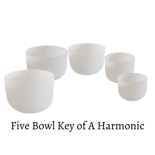 This set includes the Perfect Fifth, Perfect Third, Octave And Fourth Harmonic in The Key Of A: 5 precisely-tuned Frosted Crystal Singing Bowls in 440hz or 432hz tuning, chosen in consideration of their voice, tone, pitch and tuning: