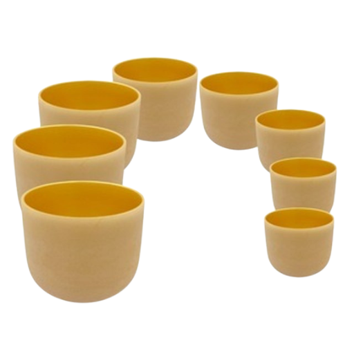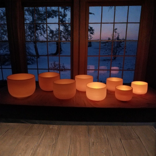This 8-bowl gold frosted crystal singing bowl set offers a full harmonic range in the key of C, including the upper octave to bring the scale to resolution.