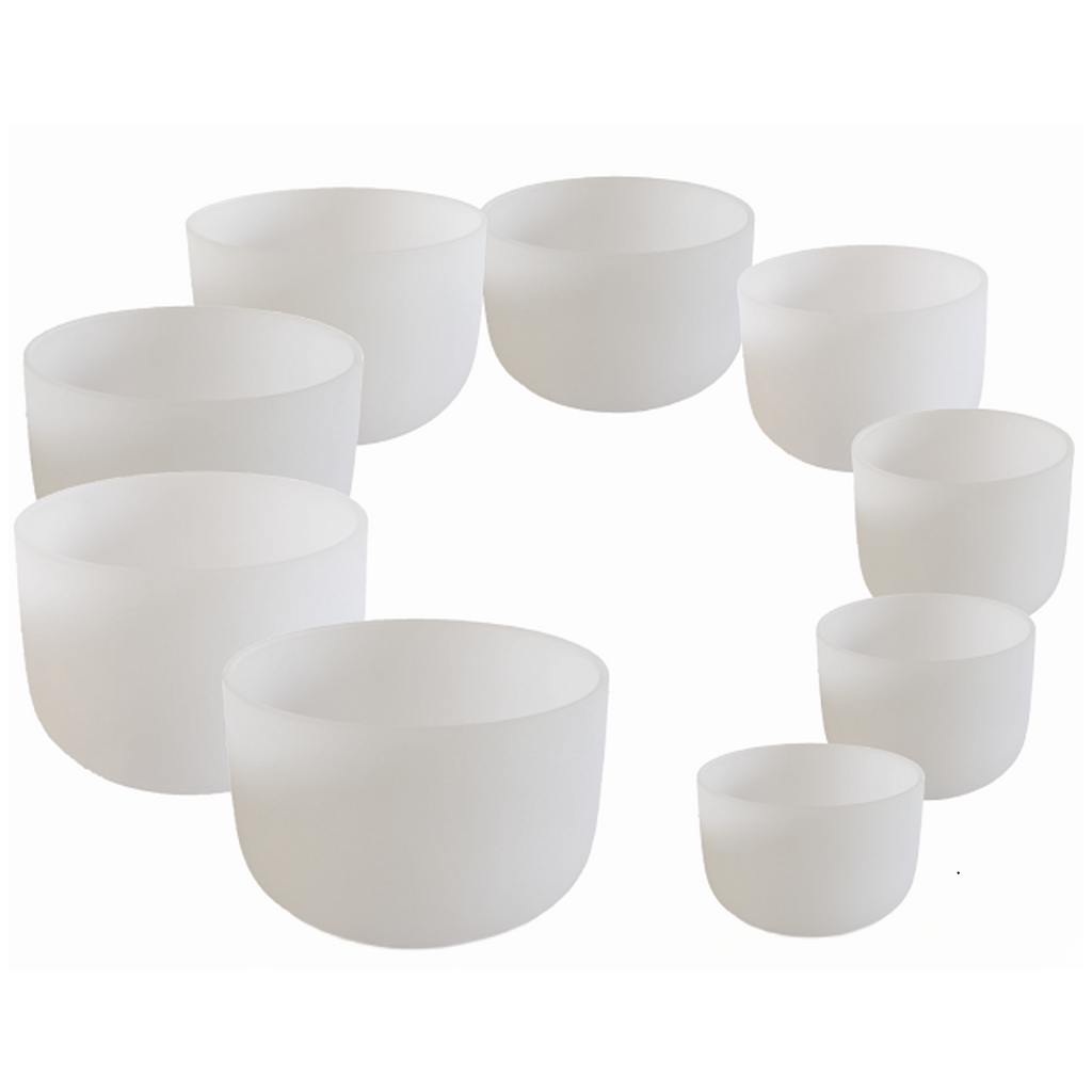 These frosted crystal singing bowl sets are designed as coherent harmonic systems, with each bowl selected for its voice, tone, and precise tuning.