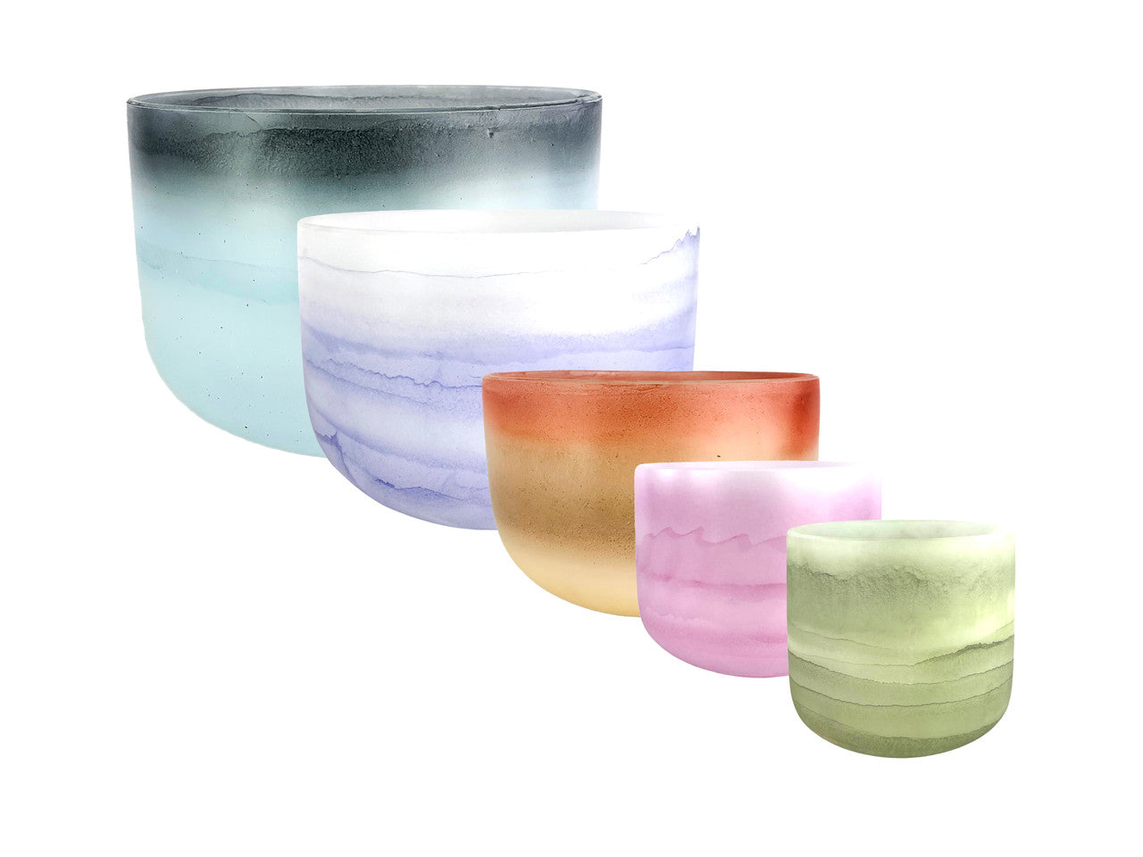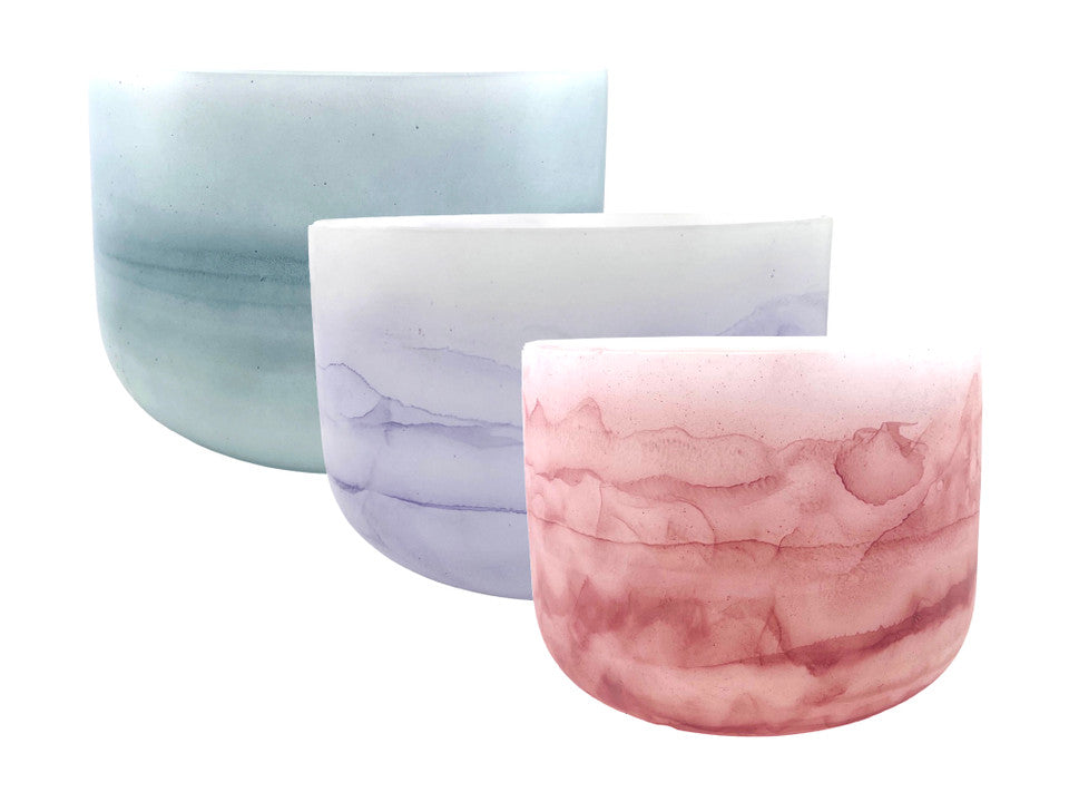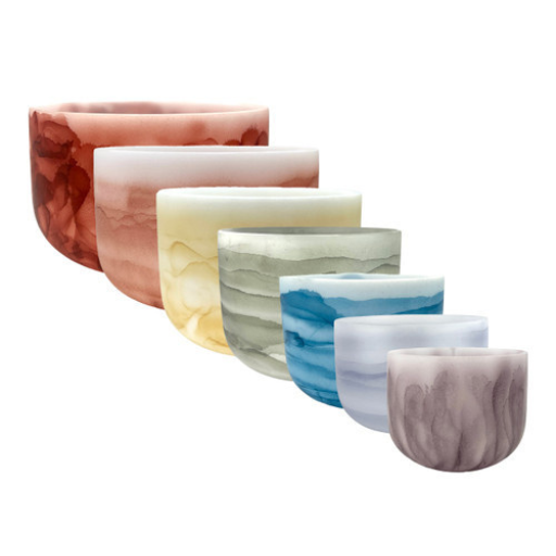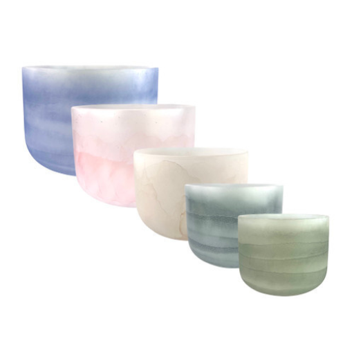 Gemstone bowl sets combine quartz crystal with infused minerals and gemstones, creating instruments with distinctive visual beauty and unique tonal textures. When played together, the bowls create layered harmonics that bring both depth and color to a sound environment. Each set offers a combination of tones designed to resonate naturally together within meditation and sound healing practice.