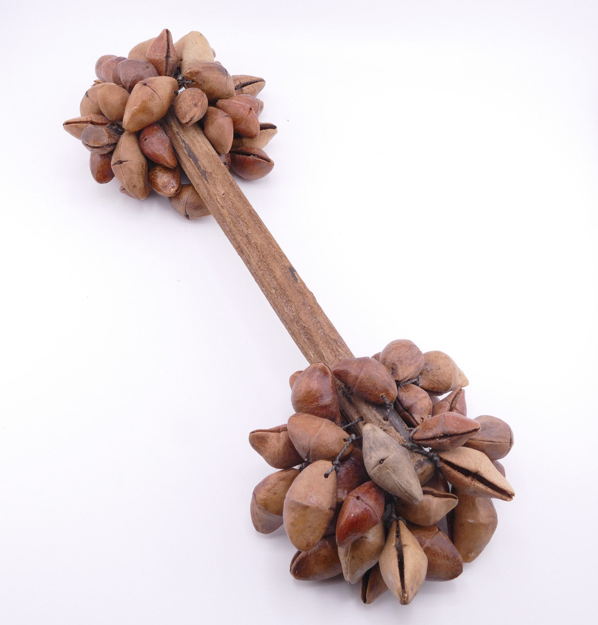 The sound is textured and organic. When held upside down and gently moved, it creates a flowing effect similar to a rainstick—soft, continuous, and immersive. The subtle clattering of the seed pods produces a soothing, layered sound that can fill a space without overwhelming it.