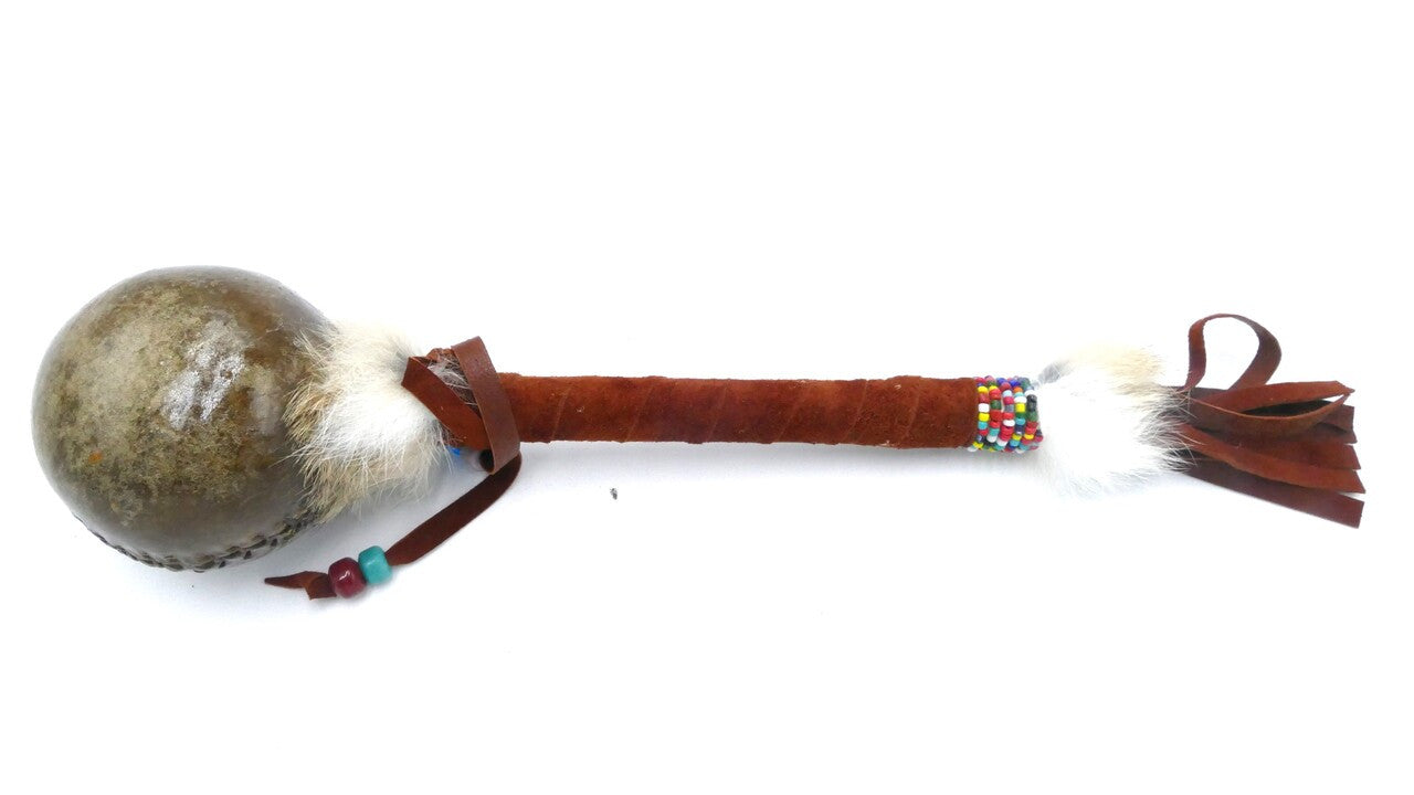 The handles are wrapped in leather and often adorned with beadwork and natural materials, adding to the individuality of each rattle.