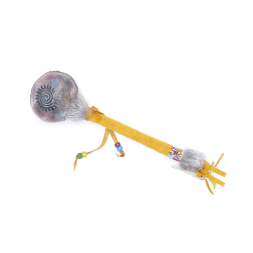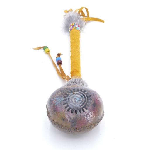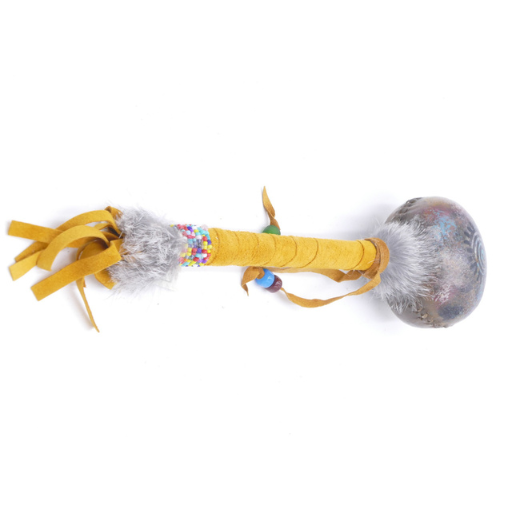 The handles are wrapped in leather and often adorned with beadwork and natural materials, adding to the individuality of each rattle.
