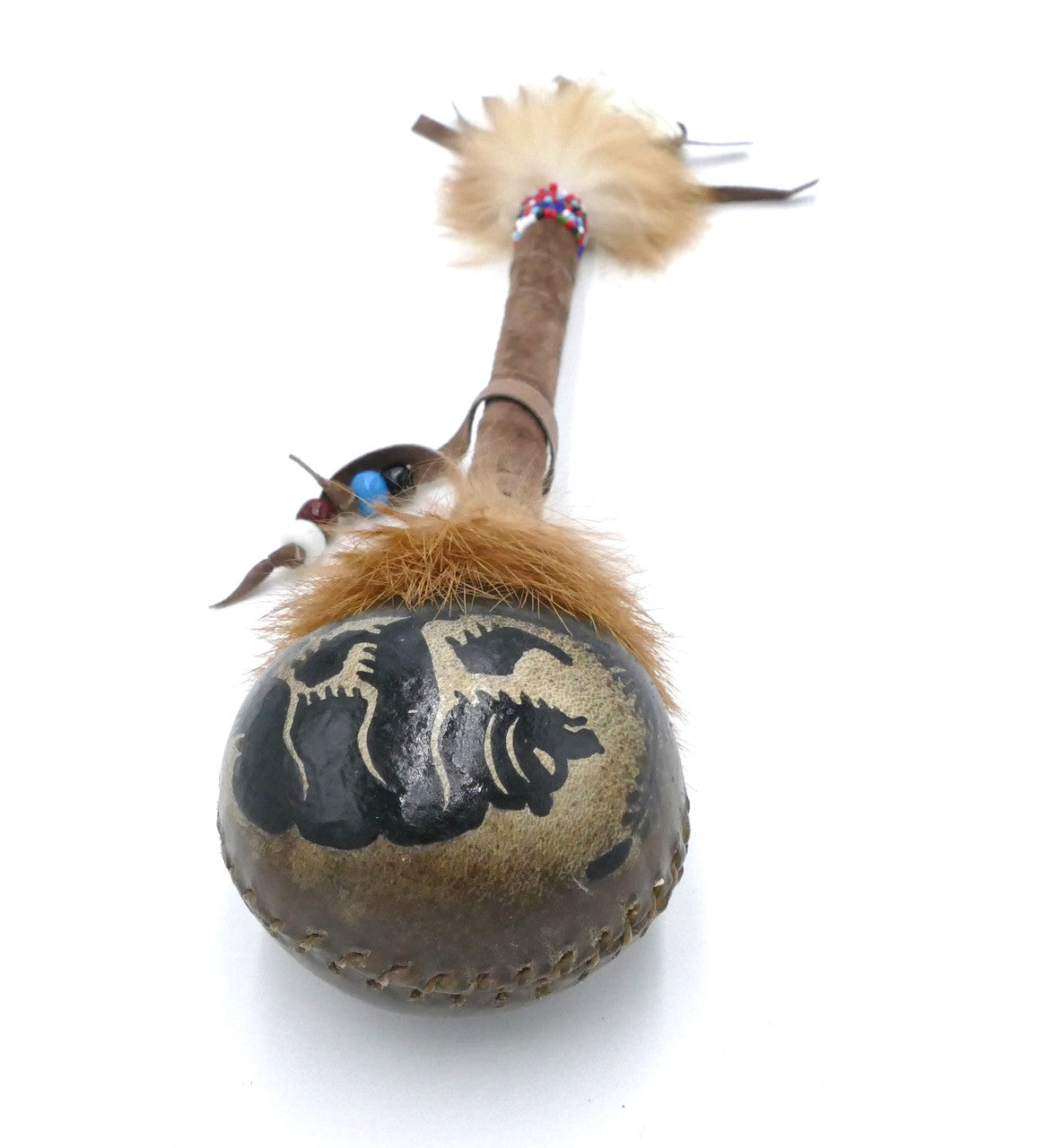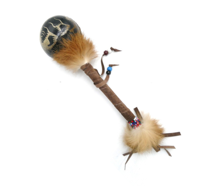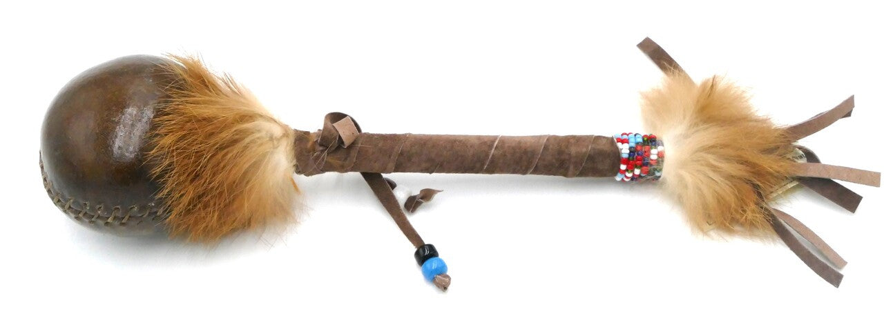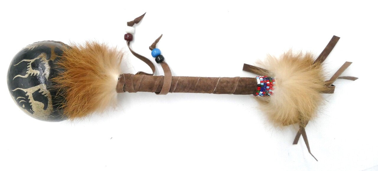 The handles are wrapped in leather and often adorned with beadwork and natural materials, adding to the individuality of each rattle.