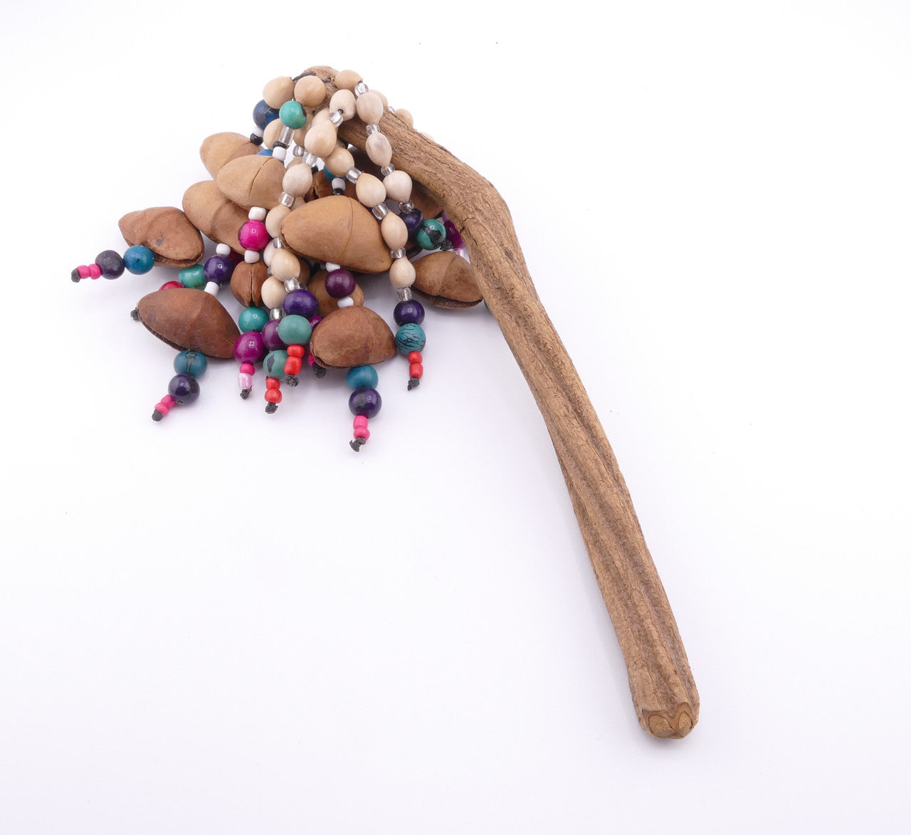 This rattle is hand-crafted in Peru using kenari seed pods and driftwood, with bead accents woven throughout.